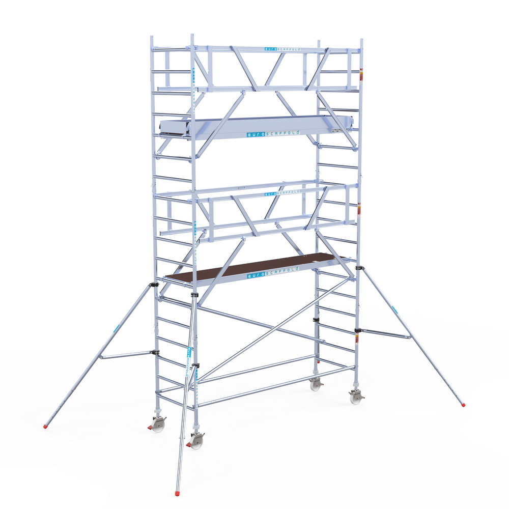 Rolsteiger van het Nederlandse merk Euroscaffold. Deze steiger voldoet aan de norm van 1 januari 2018 waarbij leuningen op heuphoogte verplicht zijn voor het betreden van het steigerplatform. De rolsteiger beschikt over dubbelzijdige voorloopleuningen.