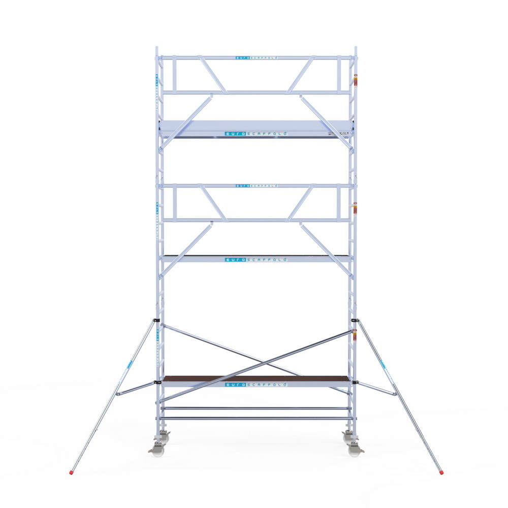 Euroscaffold rolsteiger met lichtgewicht vloeren. Deze steiger voldoet aan de norm van 1 januari 2018 waarbij leuningen op heuphoogte verplicht zijn voor het betreden van het steigerplatform. De rolsteiger beschikt over enkelzijdige voorloopleuningen.