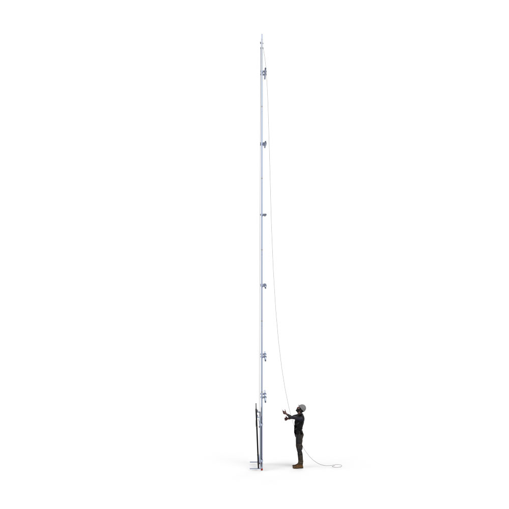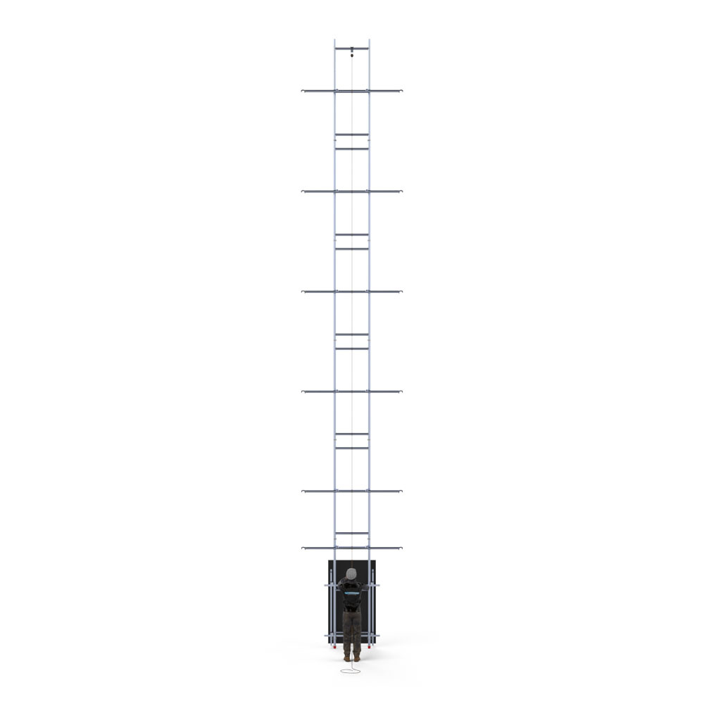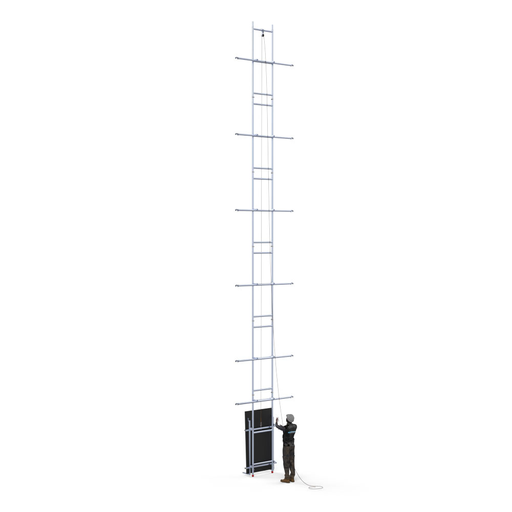 Plaats het zonnepaneel in de takelinstallatie van de steigerlift en takel het paneel via het hijstouw naar de gewenste hoogte. Het omhoog brengen van zonnepanelen ging nog nooit zo eenvoudig. Niet meer onhandig met de hand zware zonnepanelen naar het hoogste steigerplatform tillen. Volledig Arbo-verantwoord en minder kans op ongelukken.