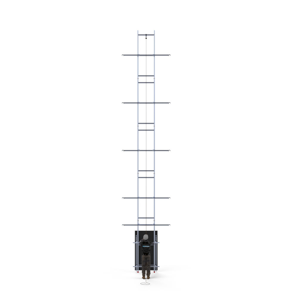 Plaats het zonnepaneel in de takelinstallatie van de steigerlift en takel het paneel via het hijstouw naar de gewenste hoogte. Het omhoog brengen van zonnepanelen ging nog nooit zo eenvoudig. Niet meer onhandig met de hand zware zonnepanelen naar het hoogste steigerplatform tillen. Volledig Arbo-verantwoord en minder kans op ongelukken. De solarlift is gemaakt van hoogwaardig aluminium in de Nederlandse fabriek van Euroscaffold.