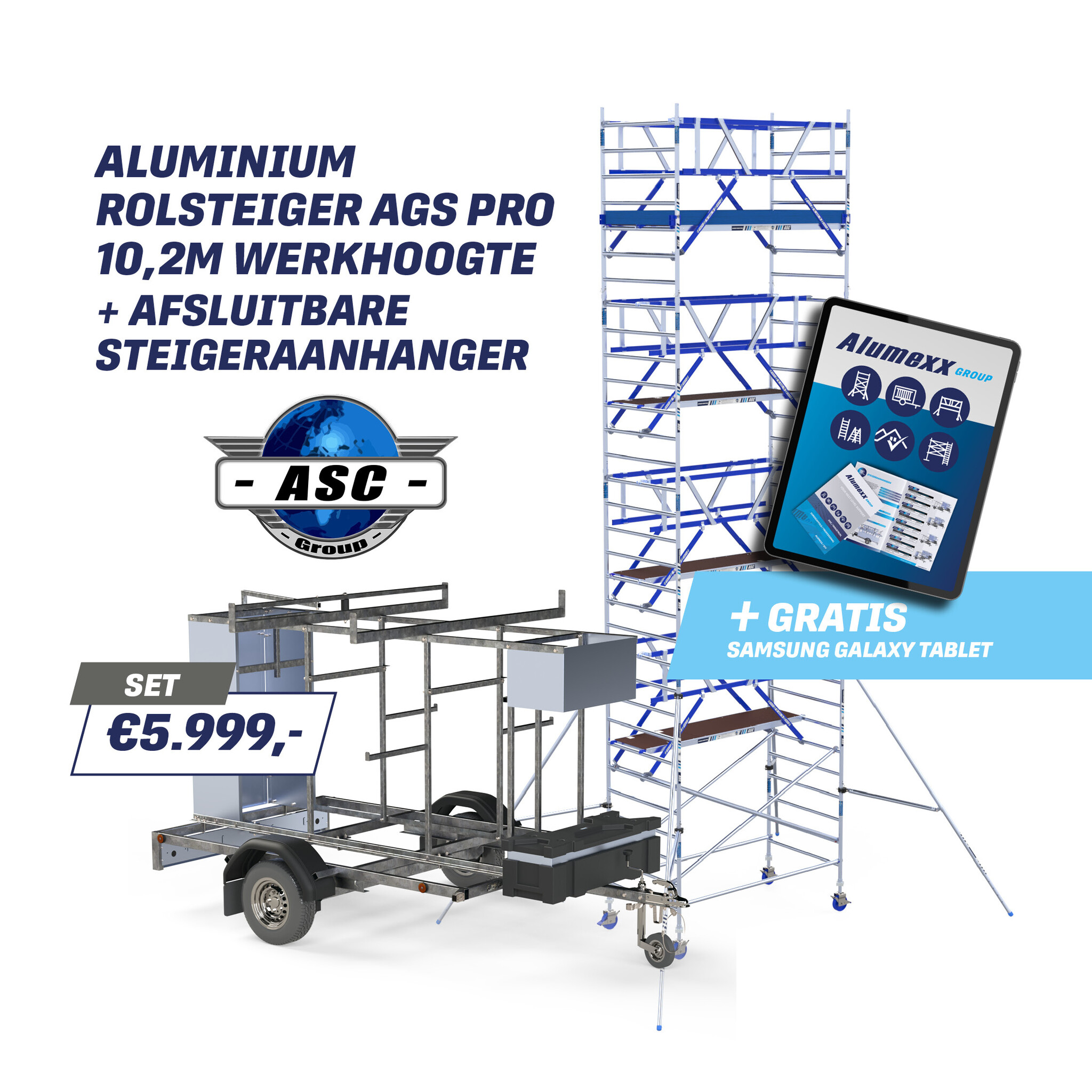 Deze ASC AGS Pro rolsteiger wordt in combinatie met de afsluitbare Euroscaffold steigeraanhanger 250, speciaal ontwikkeld om rolsteigers makkelijk te vervoeren.
