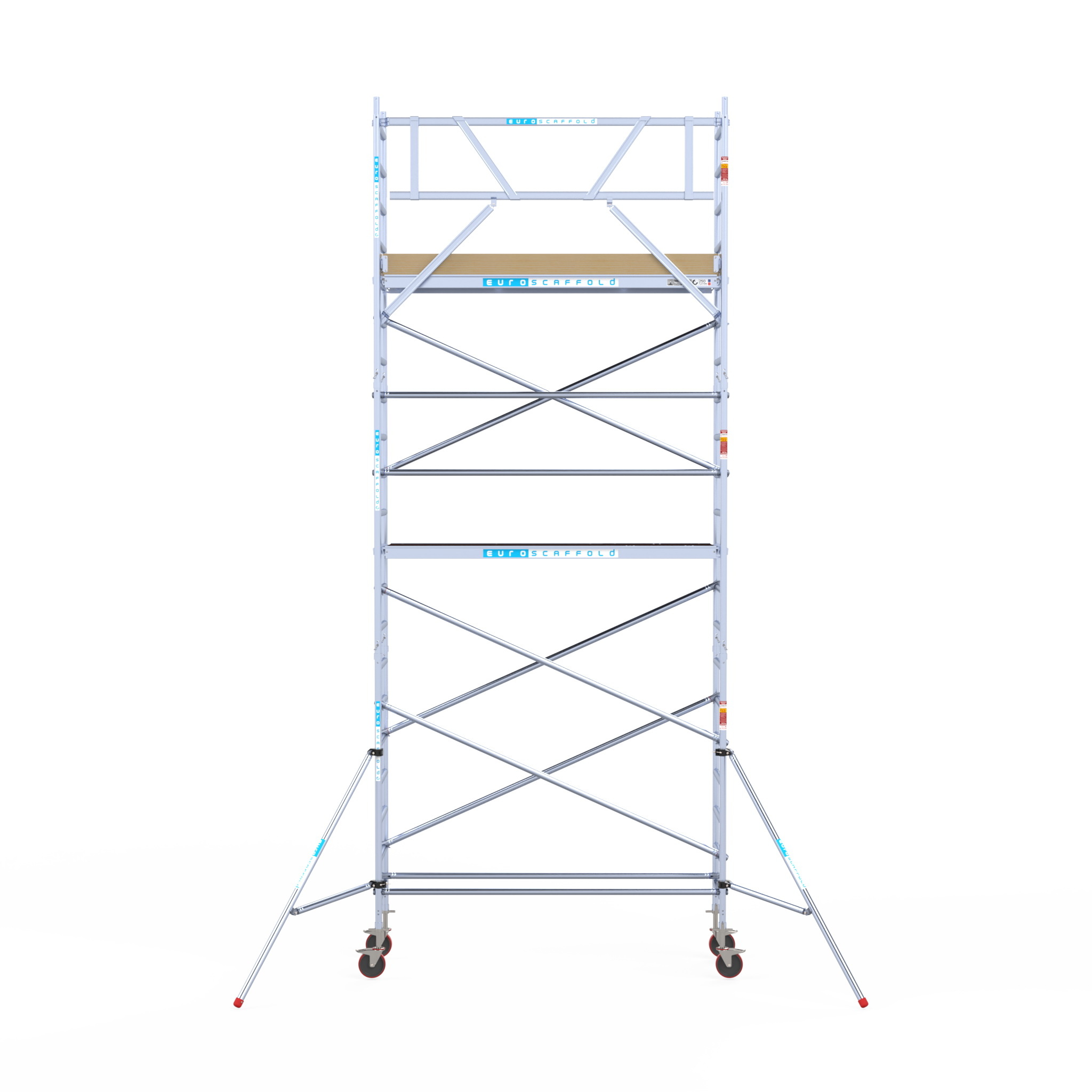 De meegeleverde rolsteiger heeft een werkhoogte van 7,2 meter en is hierdoor ideaal voor werkzaamheden tot de tweede verdieping. De rolsteiger is de smalste steiger uit ons assortiment (75 cm) en heeft een lengte van 250 cm. Deze combinatie maakt het mogelijk in krappe/smalle ruimtes op grote hoogte te werken. De rolsteiger is eenvoudig op- en af te bouwen en voldoet aan de strengste eisen omtrent veilig werken op grote hoogte. De rolsteiger wordt geleverd met 5 jaar garantie en beschikt over een TÜV certificaat. Bestelt u vandaag voor 15.00 uur? Dan leveren wij de volgende werkdag al.
