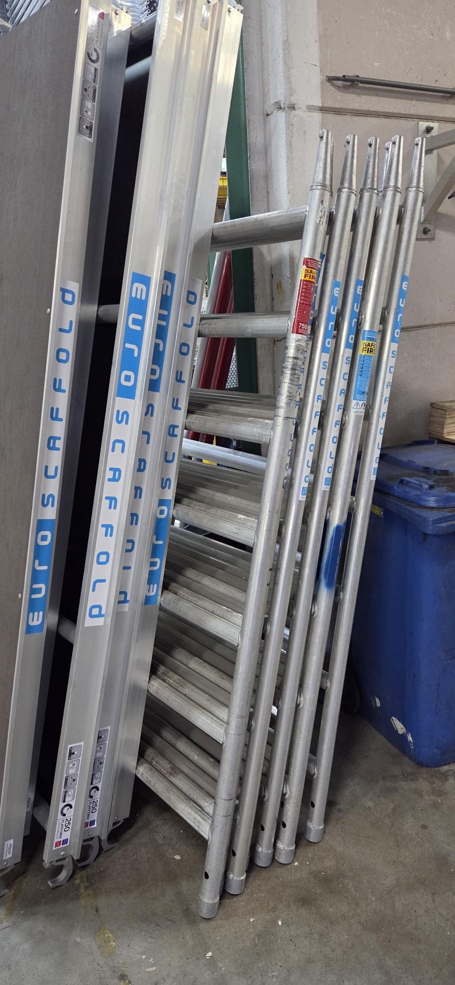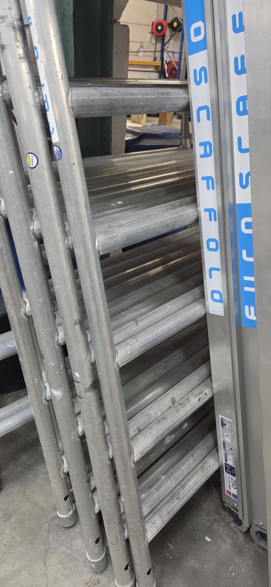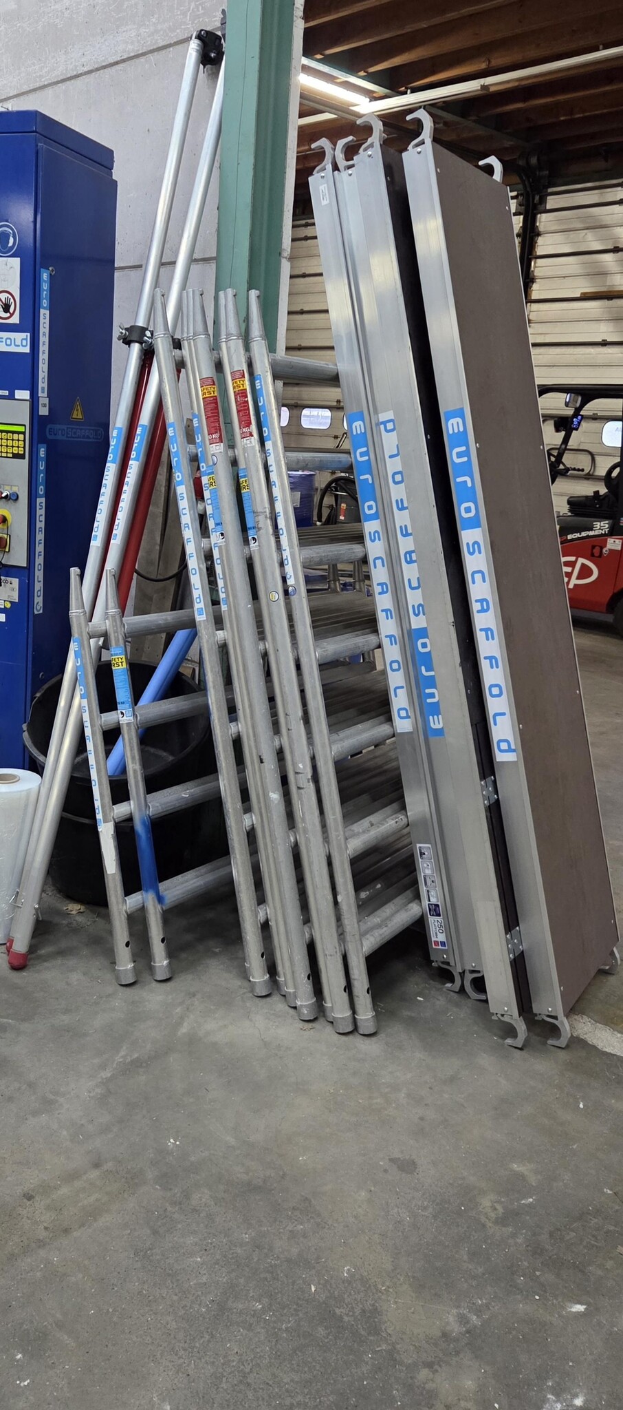 Deze gebruikte steiger is compleet, stabiel en direct inzetbaar met robuuste aluminium frames, veilige platformen en alle benodigde schoren en stabilisatoren.