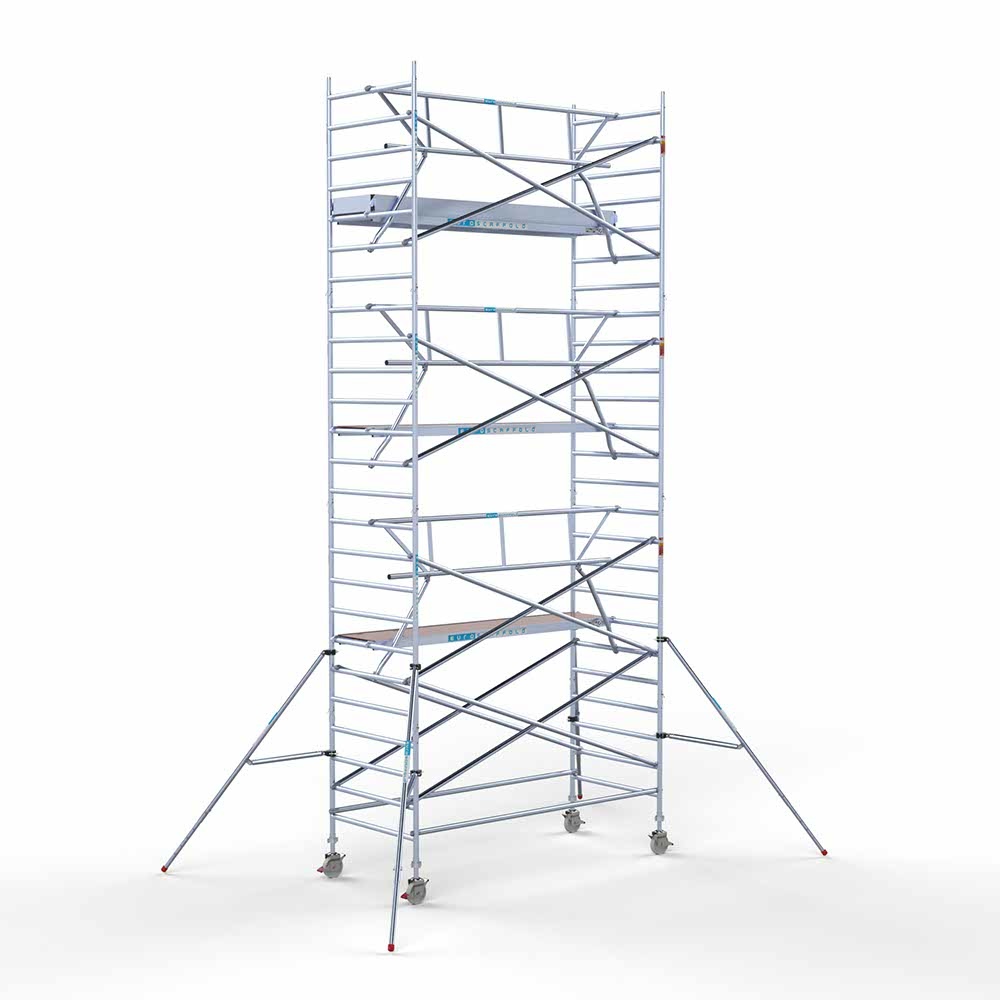 Kies de juiste werkhoogte voor uw rolsteiger. Werkhoogte wordt als volgt berekend: de hoogte van het hoogste platform plus de gemiddelde hoogte van de handen als een persoon met omhoog gestrekte armen werkt (hiervoor rekenen we 2 meter). De formule om de werkhoogte te berekenen is dus: platformhoogte + 2 meter.