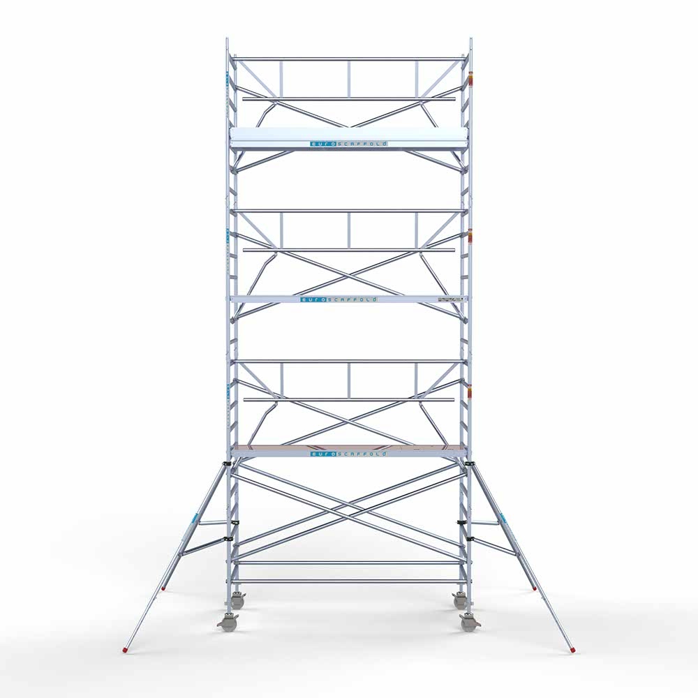 Euroscaffold rolsteigeraanhanger 305 inclusief Standaard rolsteiger (professioneel) van 135x305 cm en 8,2 meter werkhoogte. De rolsteiger beschikt over eenzijdige voorloopleuningen voor veilig werken op hoogte.