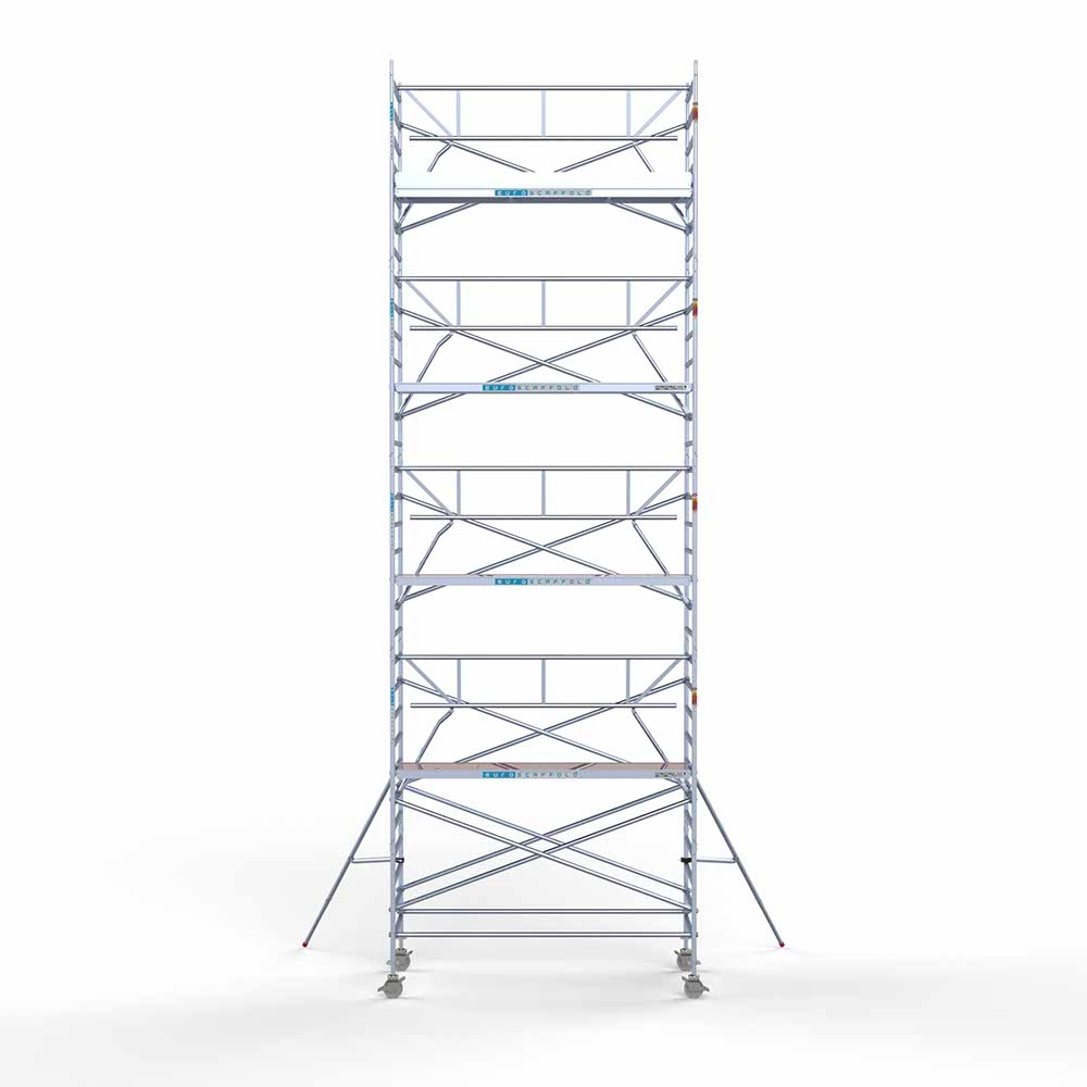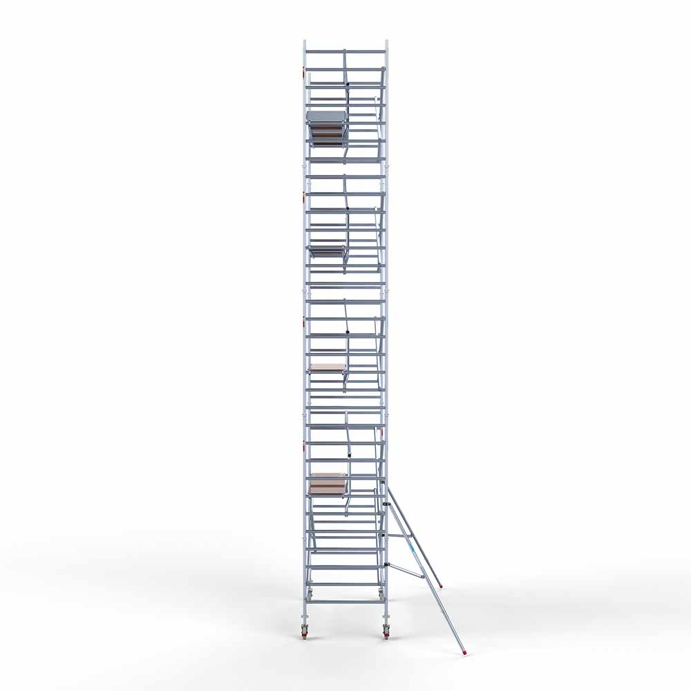 Euroscaffold rolsteigeraanhanger 305 inclusief Standaard rolsteiger (professioneel) van 135x305 cm en 10,2 meter werkhoogte. De rolsteiger beschikt over eenzijdige voorloopleuningen voor veilig werken op hoogte.