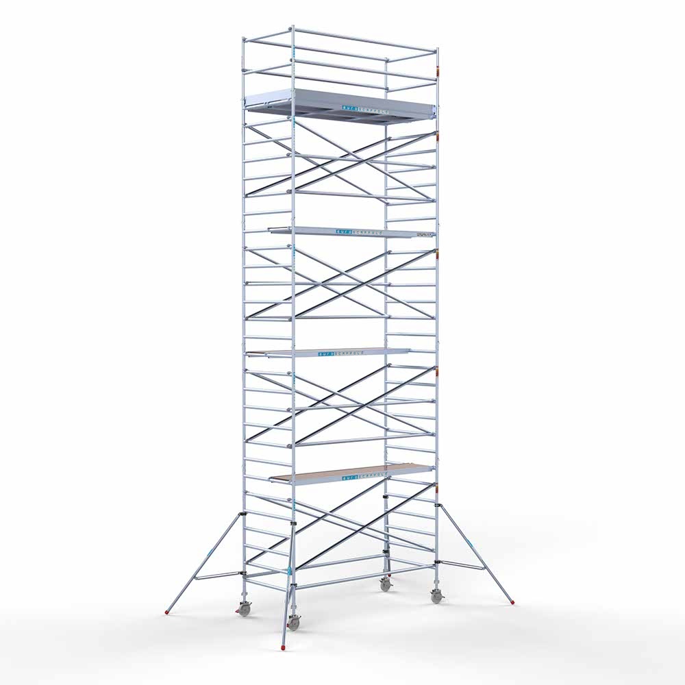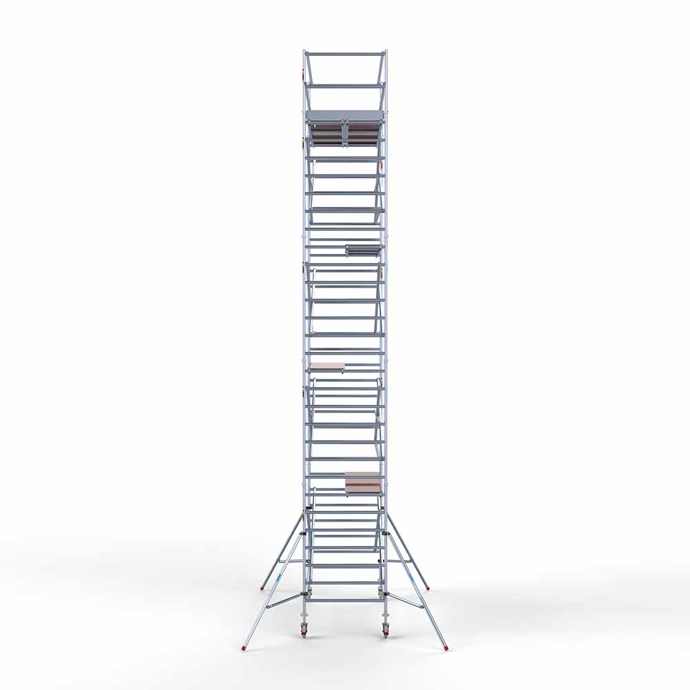 Kies de juiste werkhoogte voor uw rolsteiger. Werkhoogte wordt als volgt berekend: de hoogte van het hoogste platform plus de gemiddelde hoogte van de handen als een persoon met omhoog gestrekte armen werkt (hiervoor rekenen we 2 meter). De formule om de werkhoogte te berekenen is dus: platformhoogte + 2 meter.