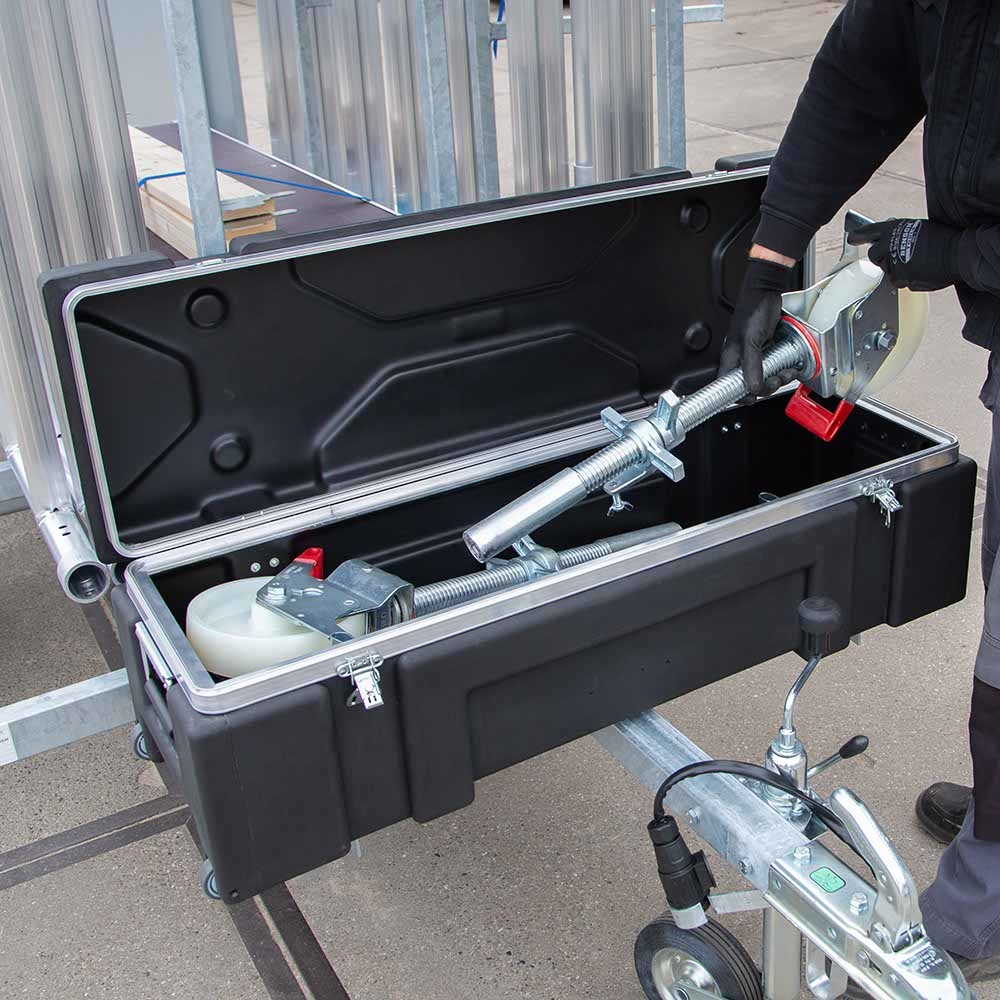 Afsluitbare Euroscaffold rolsteigeraanhanger 305 inclusief Standaard rolsteiger (professioneel) van 135x305 cm en 10,2 meter werkhoogte. De rolsteiger beschikt over eenzijdige voorloopleuningen voor veilig werken op hoogte.