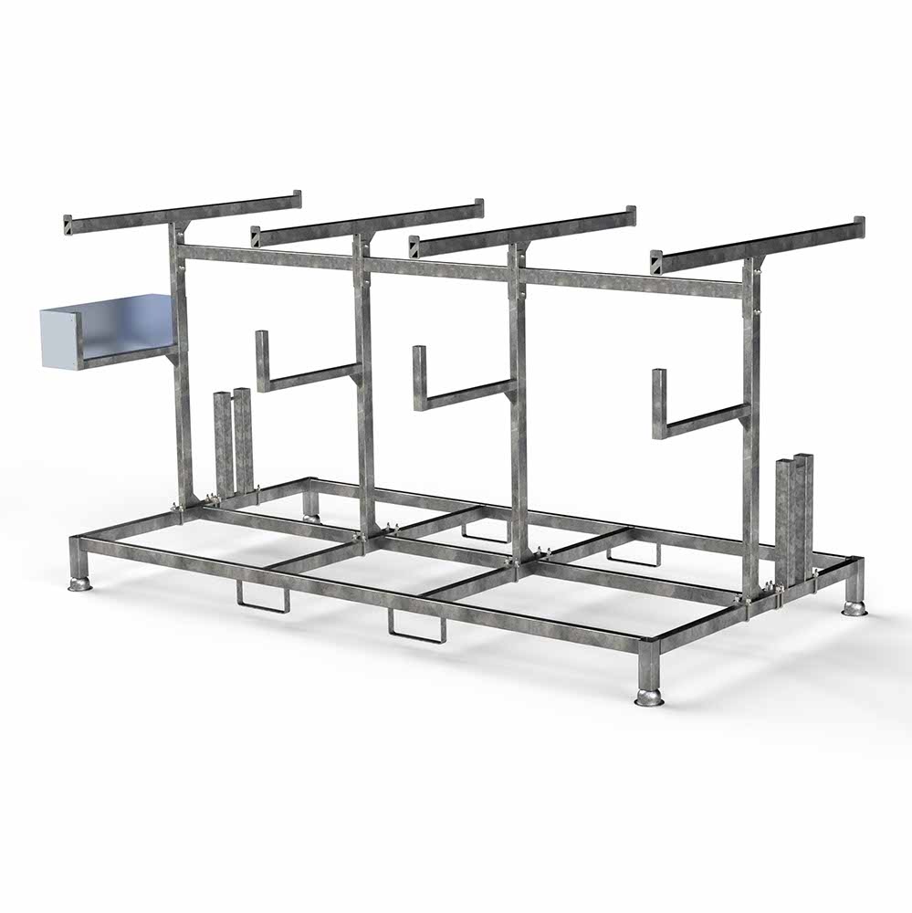 Gebruiksvriendelijke steigerbok voor het efficiënt opbergen en vervoeren van uw rolsteiger met een lengtemaat van 250 en 305 cm. De steigerbok is thermisch verzinkt en voorzien van twee kokers voor het laden met een heftruck. Met de bok voorkomt u beschadigingen aan uw steiger tijdens het vervoer. Alle steigeronderdelen liggen vast en overzichtelijk op de aanhanger. U ziet direct of alle onderdelen van de steiger aanwezig zijn, zodat u niets kunt vergeten. De bok kan compleet met steiger in één keer in de steigeraanhanger worden geladen, waardoor u tijd bespaart. De transportbok biedt ruimte aan maximaal 8 platformen, en rolsteigers met een werkhoogte van maximaal 14 meter.