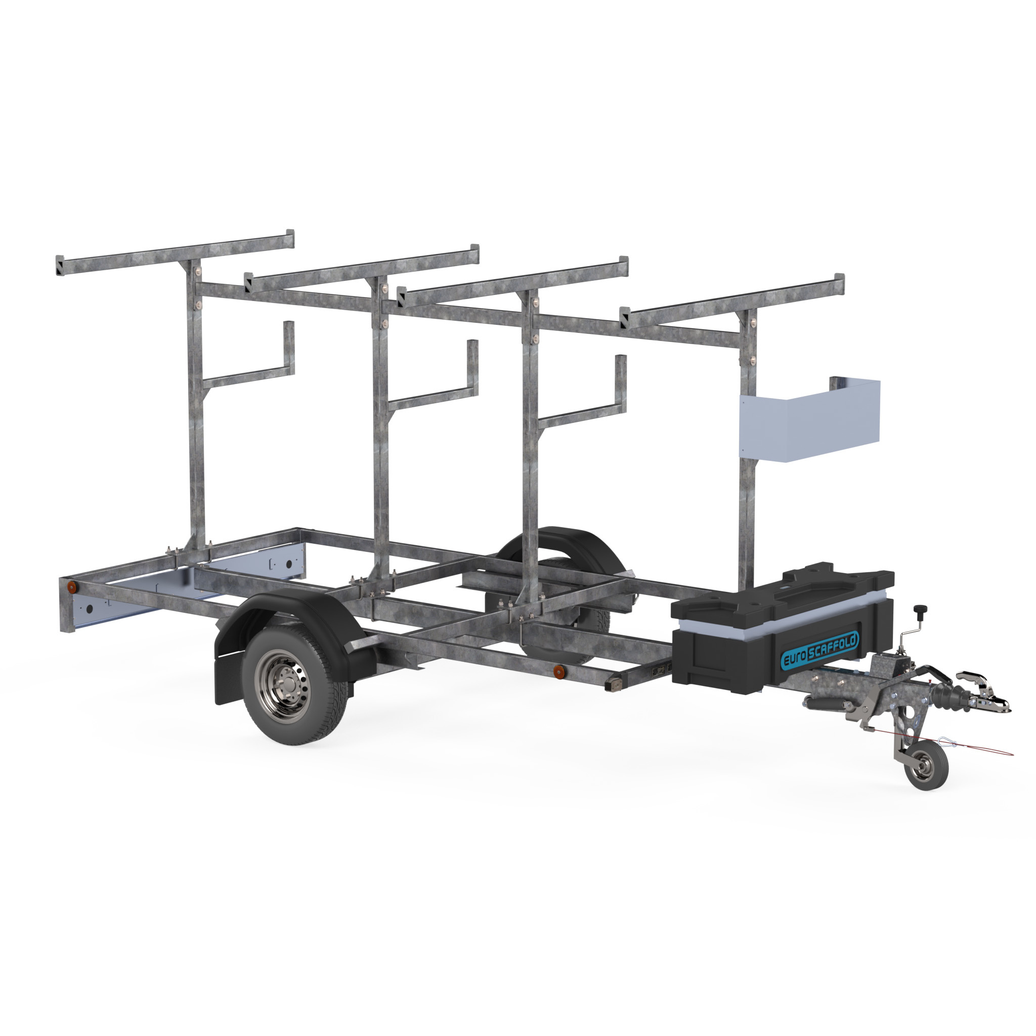 De 1350 kg zware kwaliteit Euroscaffold Steigeraanhanger is geremd en geschikt voor het vervoeren van uw aluminium rolsteiger plus extra materialen. Deze steigeraanhanger kan maar liefst 14 meter aan steigermateriaal vervoeren en extra onderdelen zoals een solar lift of dakrandbeveiliging vervoeren. Een makkelijkere manier van een steiger vervoeren bestaat niet!