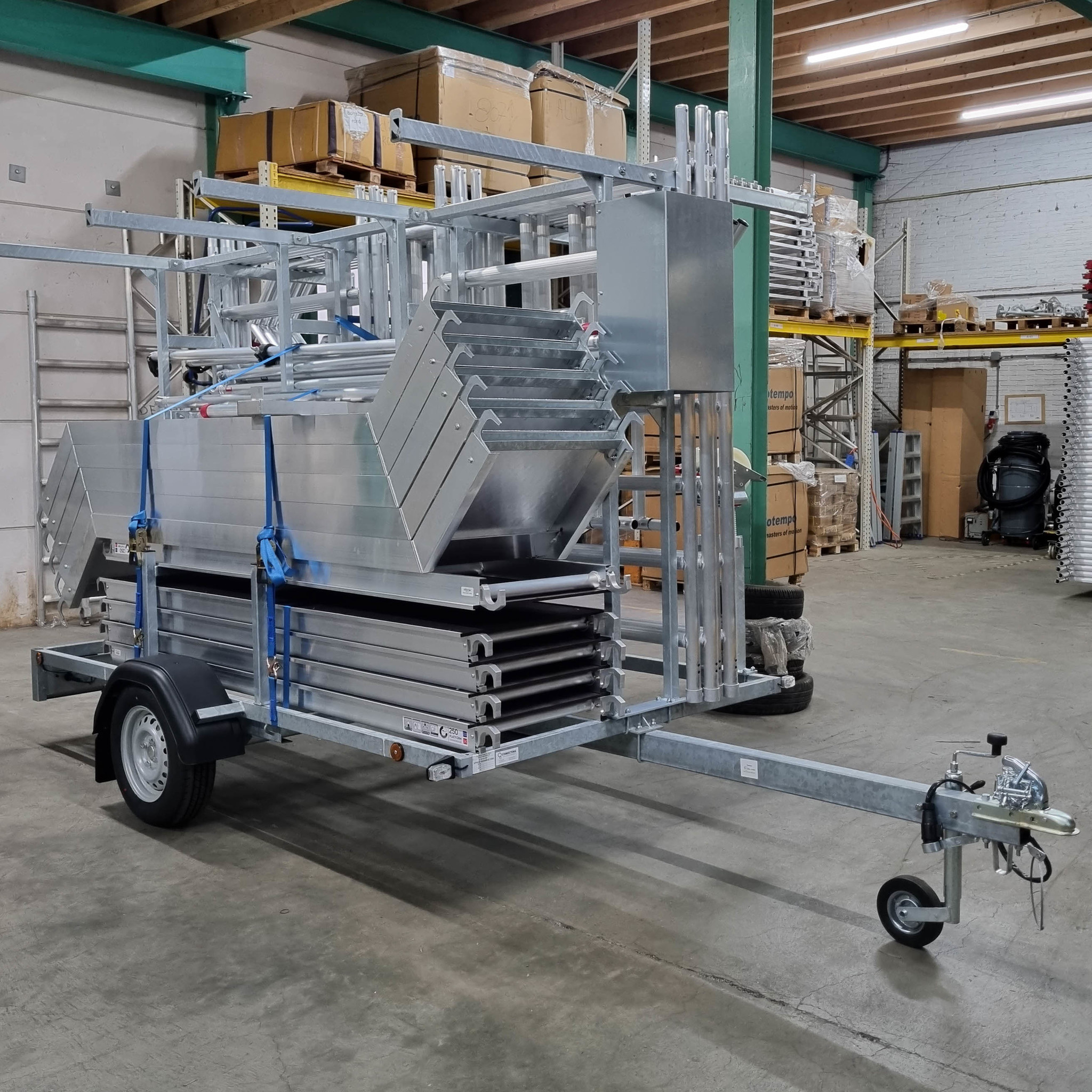 De trappentoren wordt geleverd met een passende aanhanger, waarop elk onderdeel zijn eigen plek heeft, hierdoor blijft alles overzichtelijk.