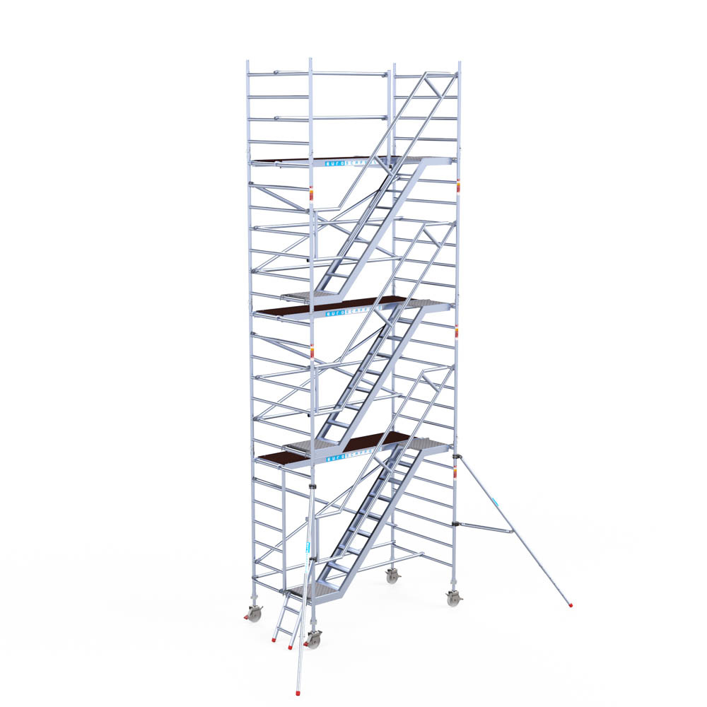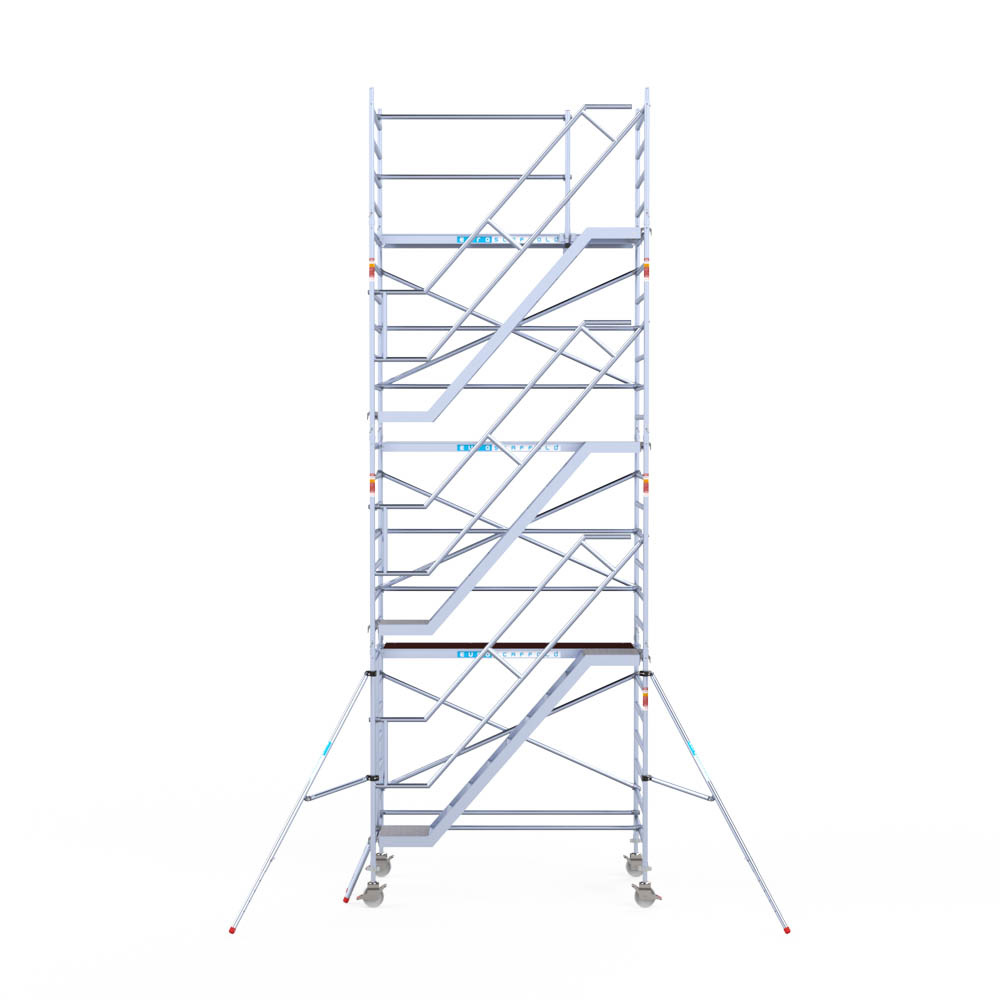 Met deze rolsteiger trappentoren van Euroscaffold met geïntegreerde trappen kunt u veilig een steiger beklimmen voor werkzaamheden aan een dak. Gereedschap en materialen kunnen dankzij de trappen gemakkelijk en snel naar boven worden gebracht. De trappen zijn uitgerust met leuningen aan de buitenzijde. De trappentorens zijn vervaardigd van hoogwaardig, lichtgewicht aluminium en hebben een lange levensduur. Alle onderdelen zijn ook los verkrijgbaar, zodat u zonder problemen een onderdeel kunt vervangen of de steigertoren verder kunt uitbreiden. De torens zijn zeer stevig, gemakkelijk verrijdbaar en snel op te bouwen en af te breken. De steiger is 135 cm breed en heeft een platformlengte van 250 cm en een platformhoogte van 6,2 meter. De veilige werkhoogte van de toren is 8,2 meter. De toren kan op steigerwielen worden geplaatst, maar op spindels staat deze het stevigst. De gebruiksvriendelijke trappentoren is geschikt voor professioneel gebruik en voldoet aan de geldende veiligheidseisen en de Arbo-regelgeving.