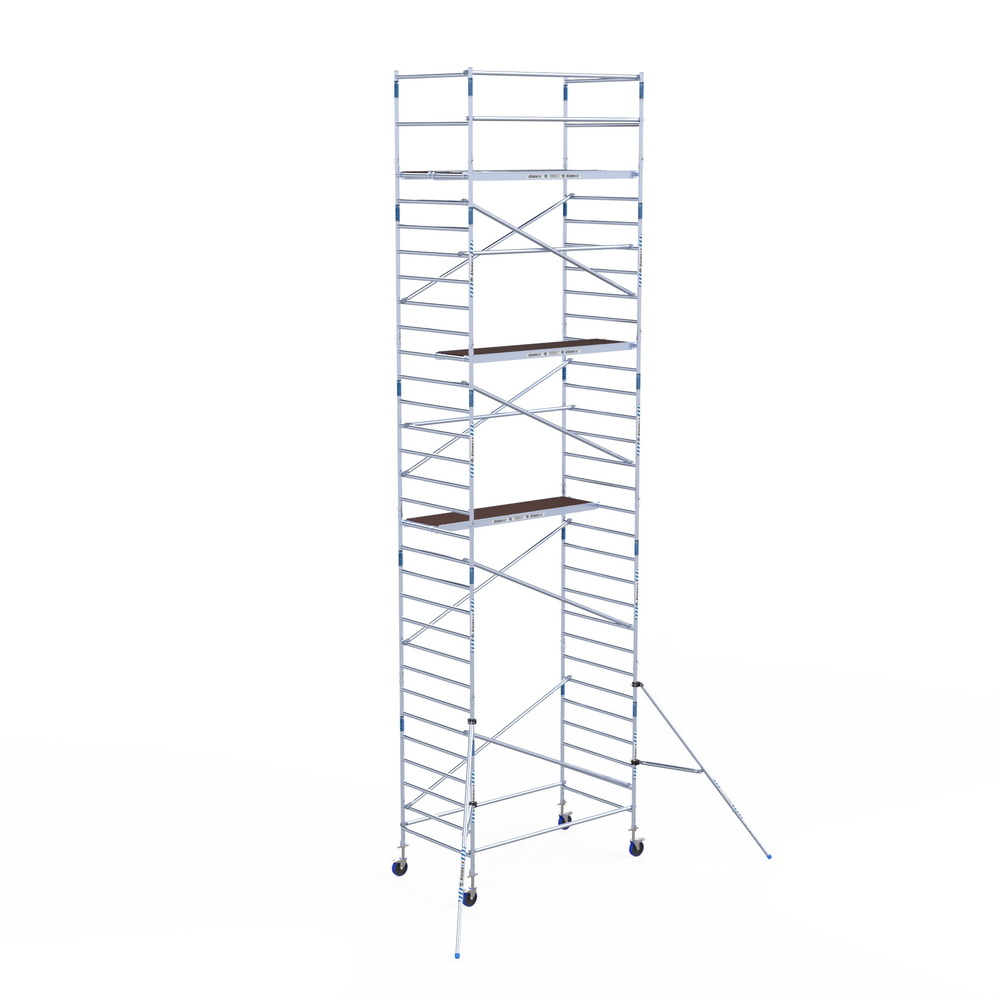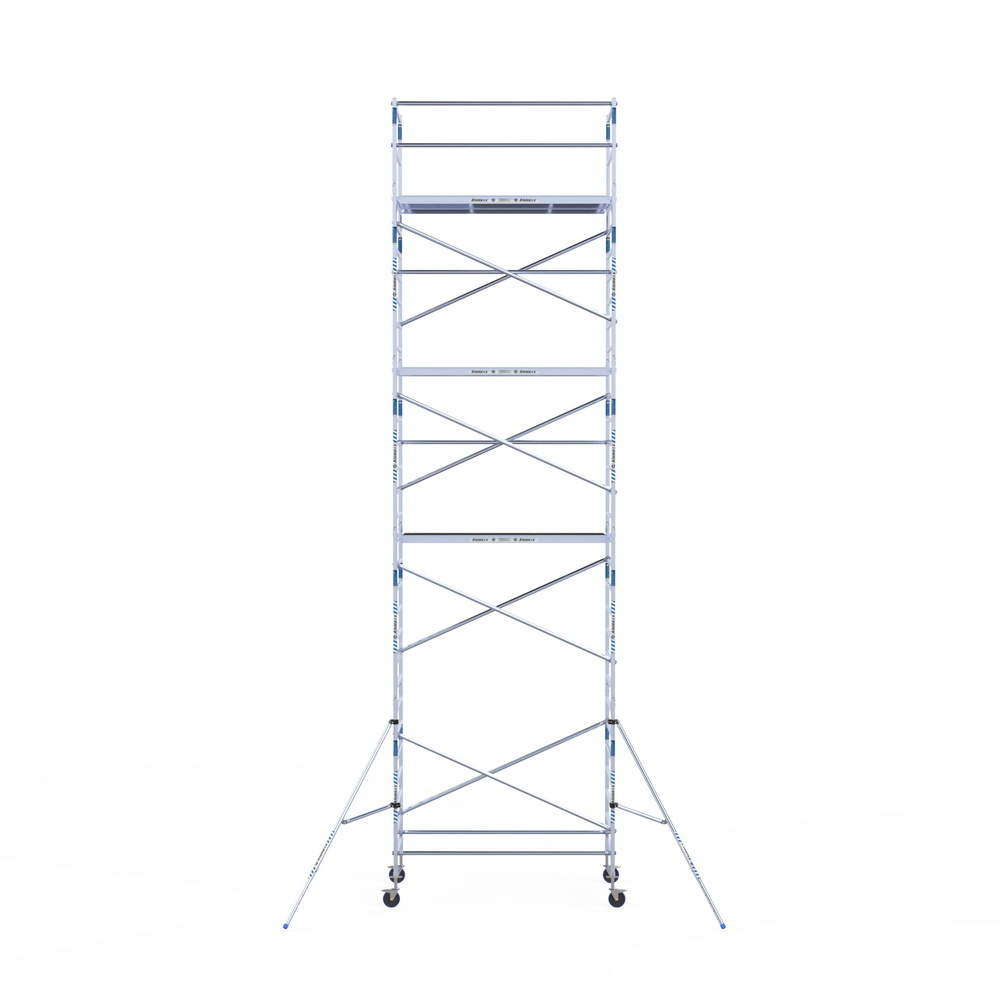 Kies de juiste werkhoogte voor uw rolsteiger. Werkhoogte wordt als volgt berekend: de hoogte van het hoogste platform plus de gemiddelde hoogte van de handen als een persoon met omhoog gestrekte armen werkt (hiervoor rekenen we 2 meter). De formule om de werkhoogte te berekenen is dus: platformhoogte + 2 meter.