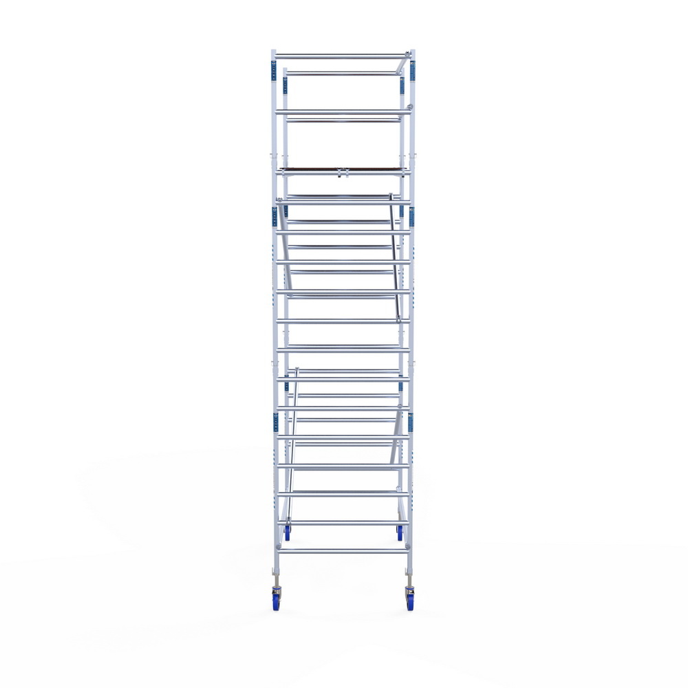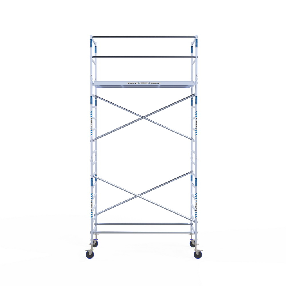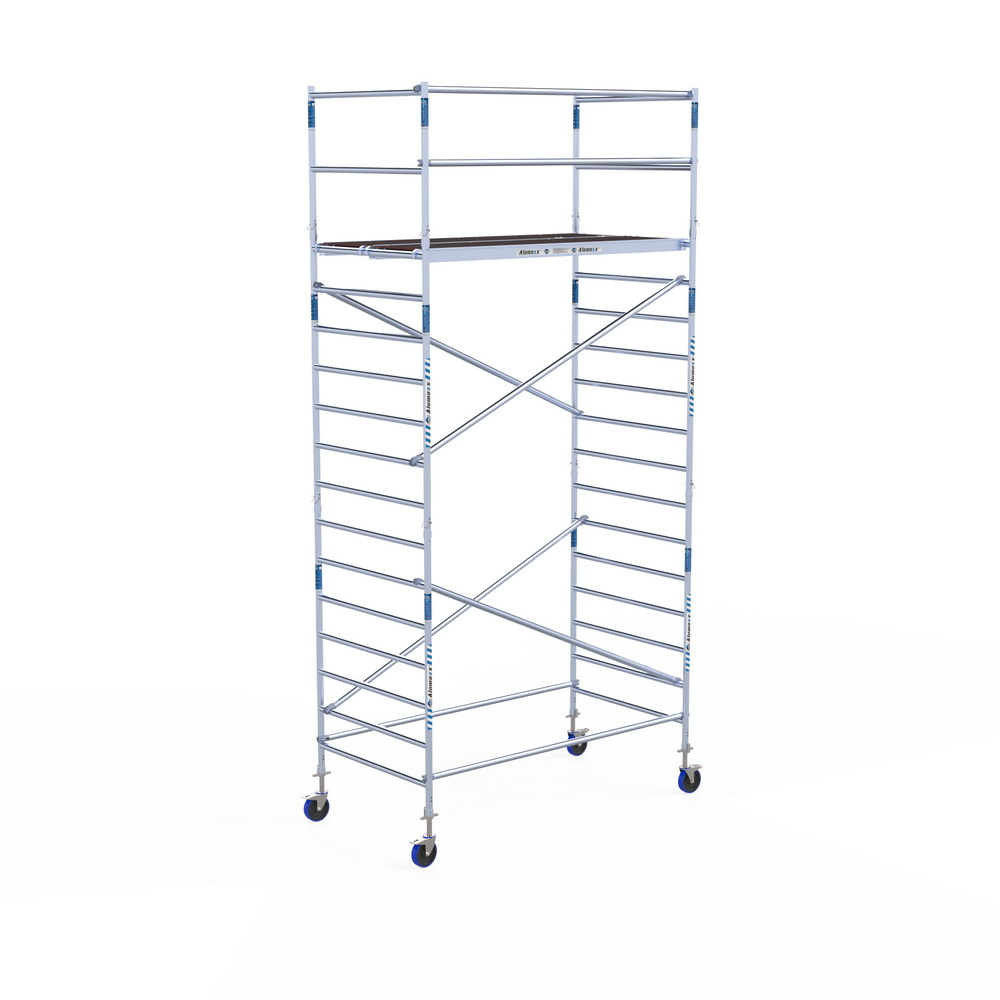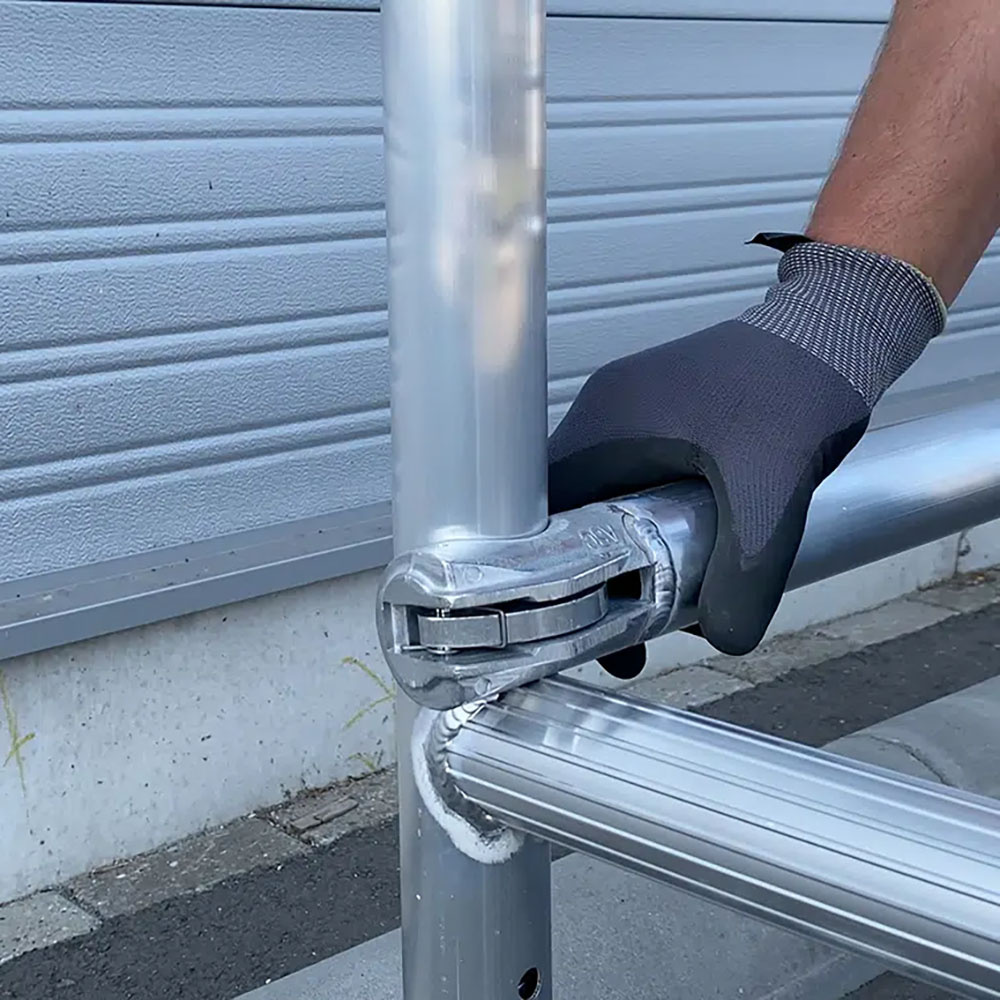Kies de juiste werkhoogte voor uw rolsteiger. Werkhoogte wordt als volgt berekend: de hoogte van het hoogste platform plus de gemiddelde hoogte van de handen als een persoon met omhoog gestrekte armen werkt (hiervoor rekenen we 2 meter). De formule om de werkhoogte te berekenen is dus: platformhoogte + 2 meter.