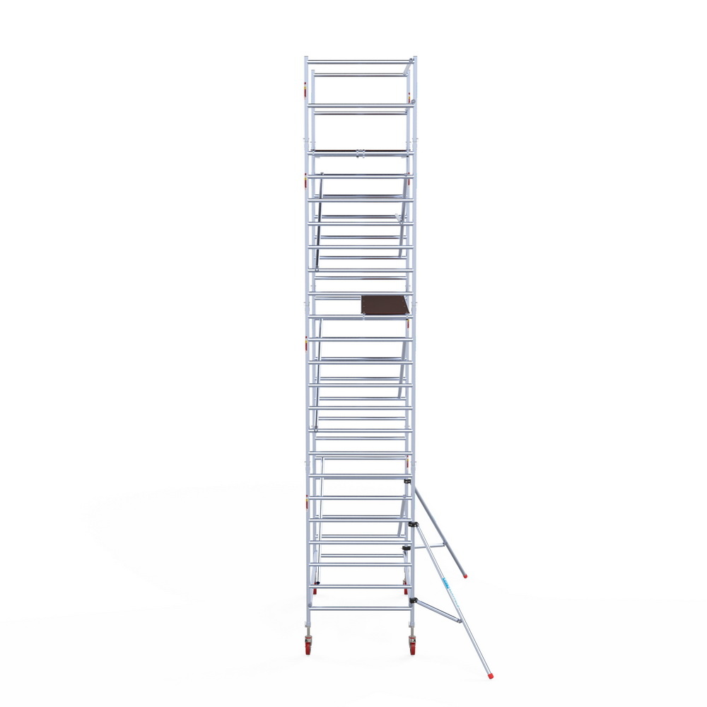 Kies de juiste werkhoogte voor uw rolsteiger. Werkhoogte wordt als volgt berekend: de hoogte van het hoogste platform plus de gemiddelde hoogte van de handen als een persoon met omhoog gestrekte armen werkt (hiervoor rekenen we 2 meter). De formule om de werkhoogte te berekenen is dus: platformhoogte + 2 meter.